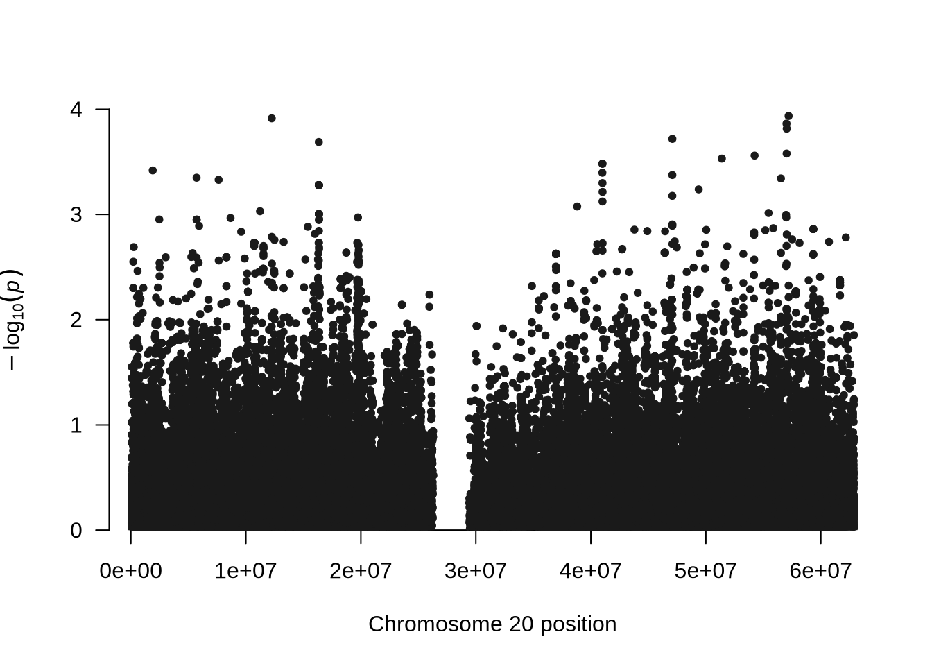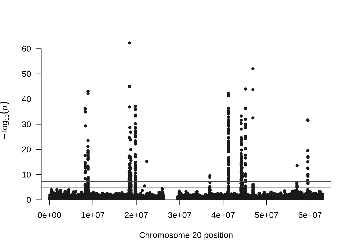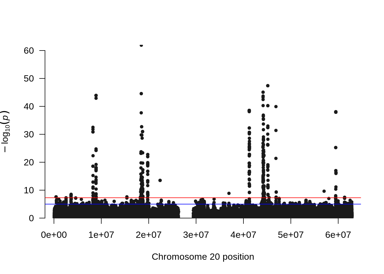 qqmanpackage provides convenient functions to visualize GWAS results. - The Manhattan plot displays all tested SNPs along chromosome 20, with the y-axis showing the –log₁₀(p-value). Peaks in the plot represent genomic regions with stronger association signals.