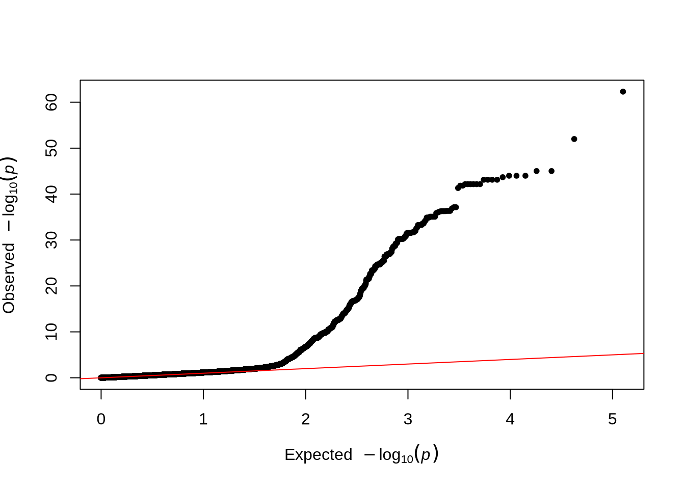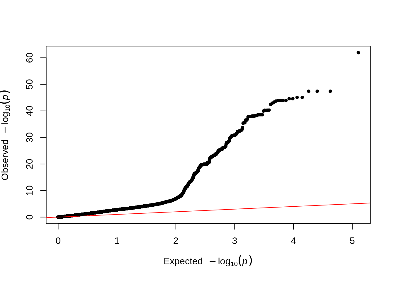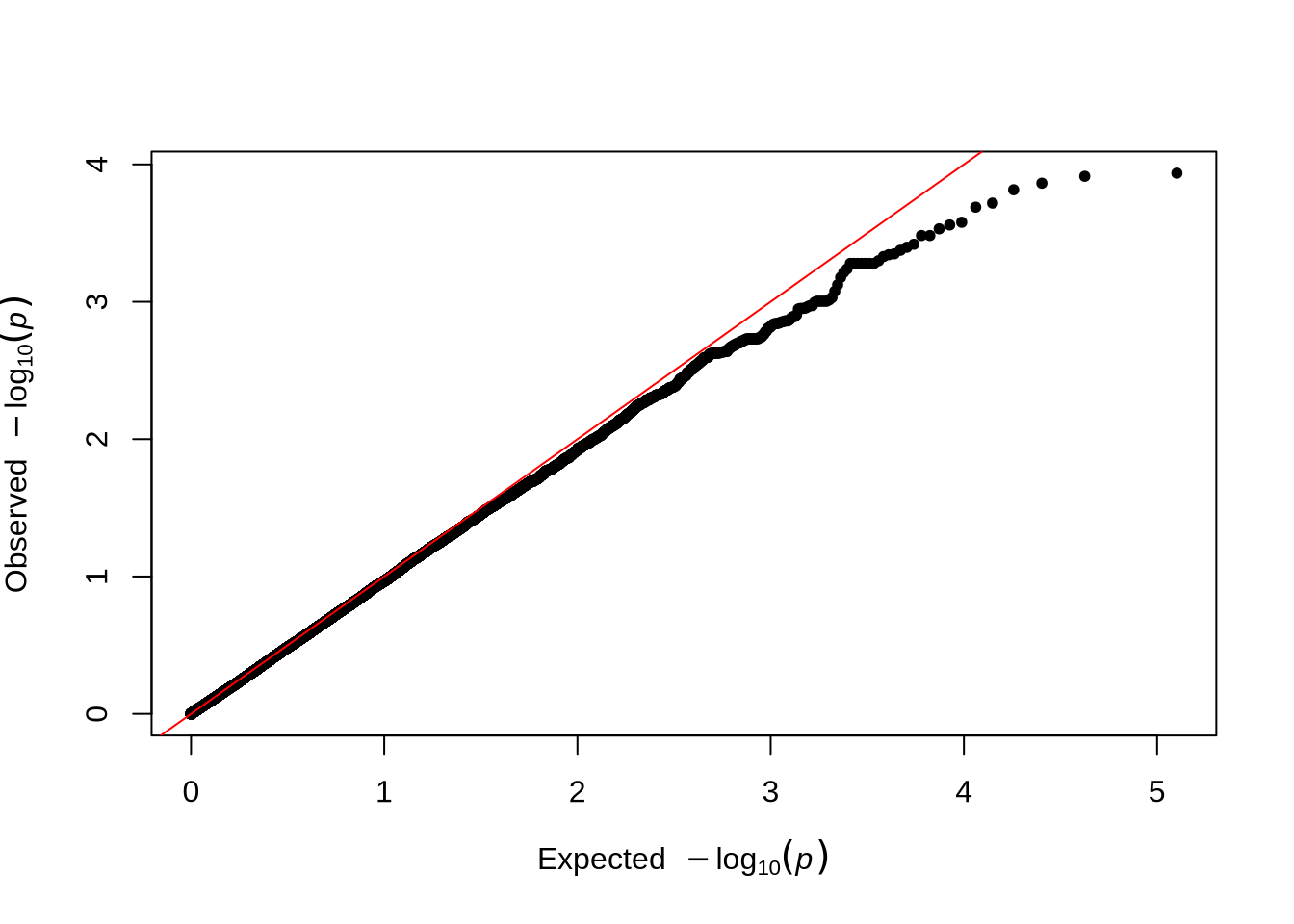 - In this unadjusted GWAS (without PCA correction), some inflation may appear, reflecting the effect of population structure or relatedness among individuals.