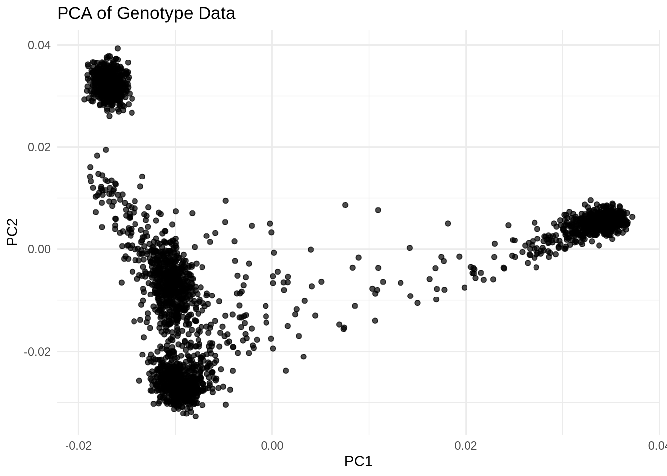 labs(title = "PCA of Genotype Data", x = "PC1", y = "PC2")