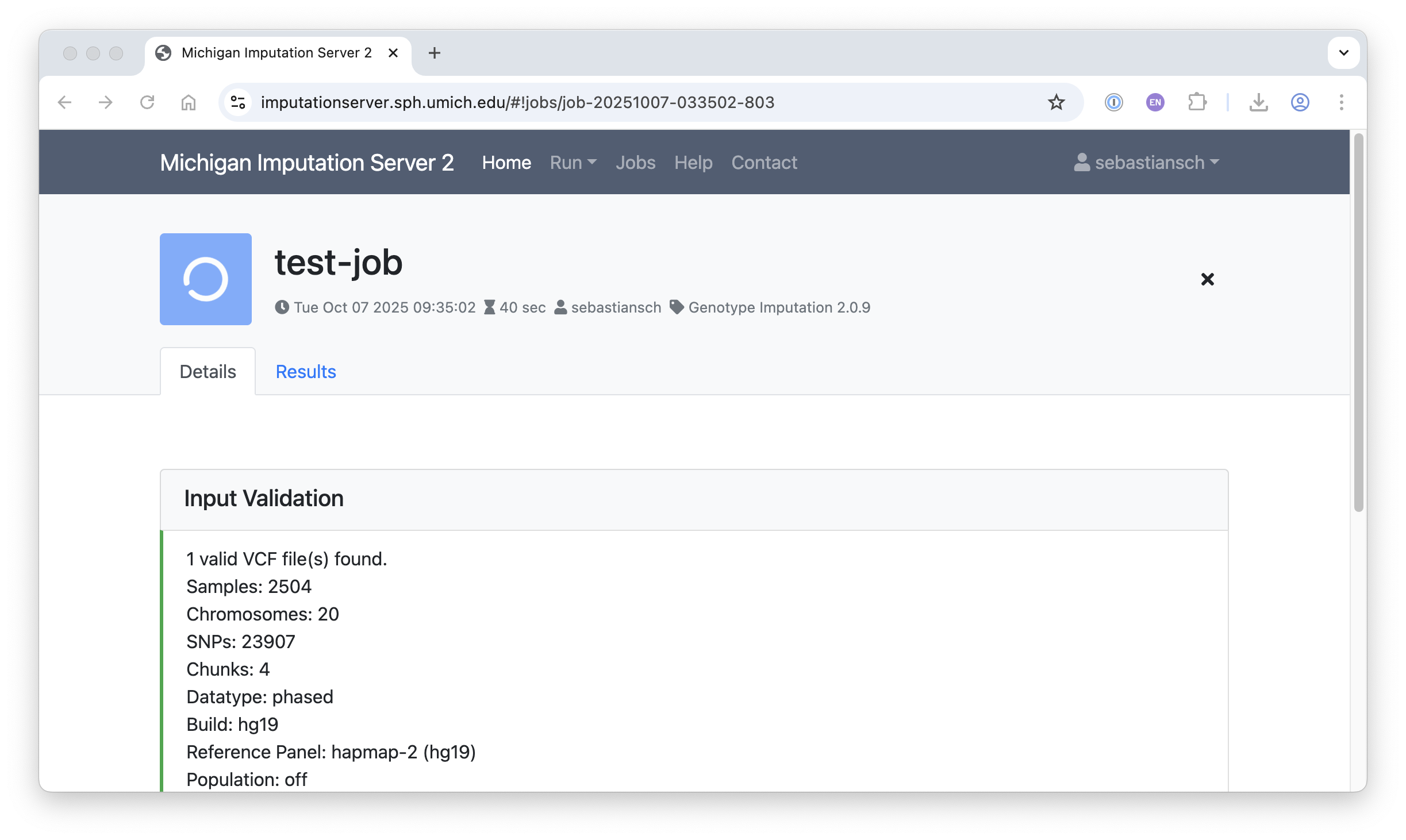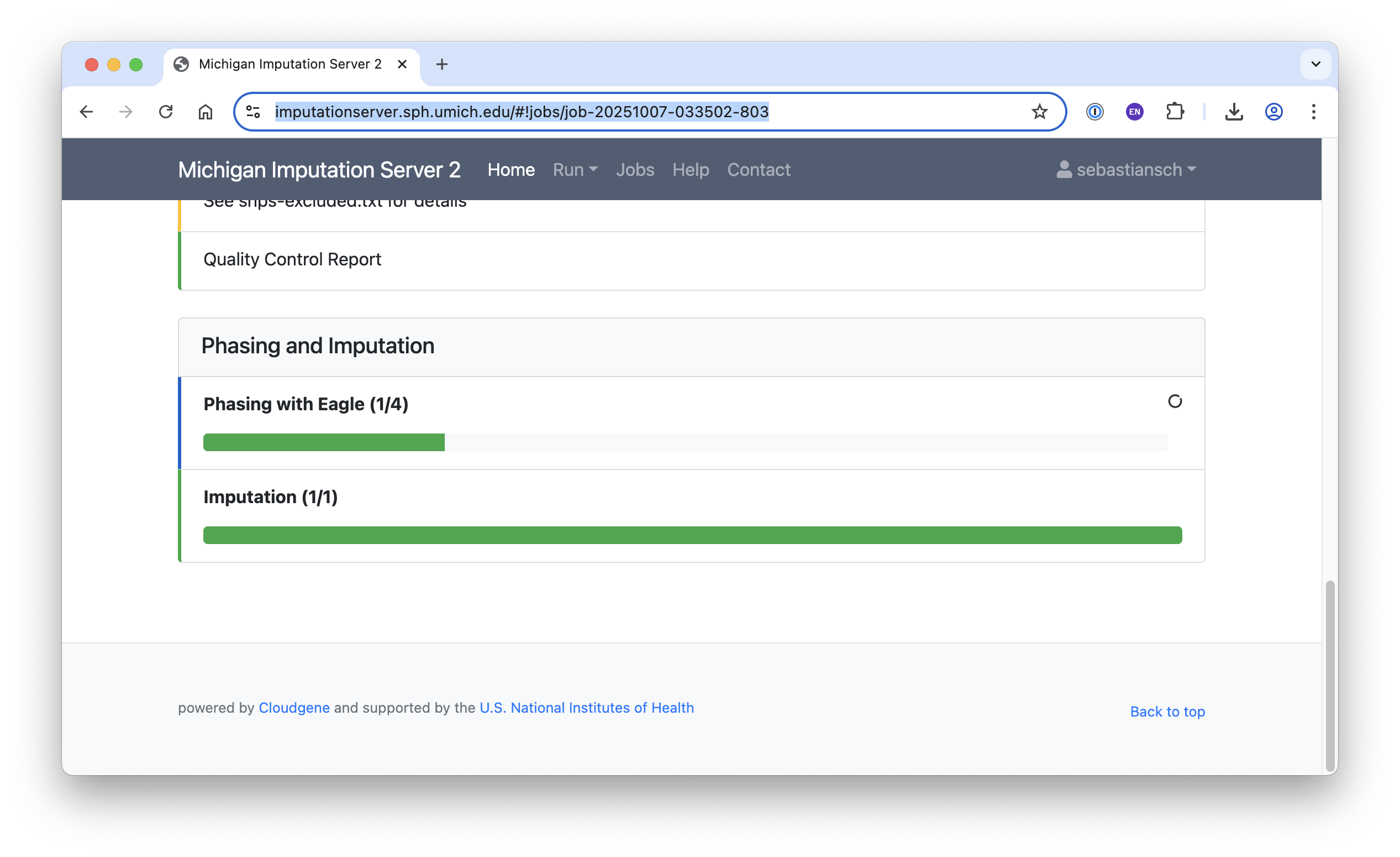 Once submitted, your job will go through Input Validation, Quality Control (QC), Phasing/Imputation and Compression/Encryption. Jobs are queued, and you will receive a notification when your imputation job is complete.