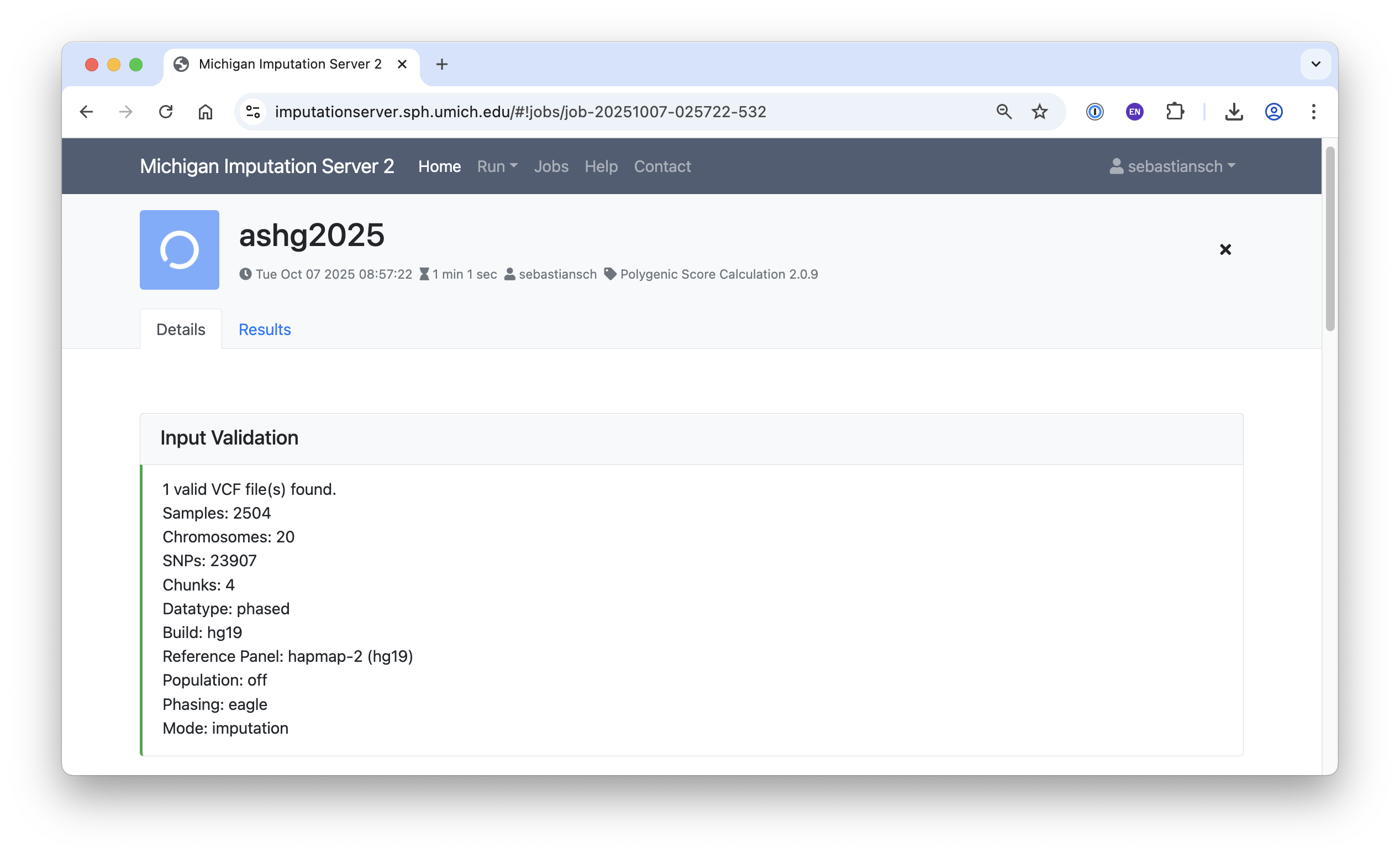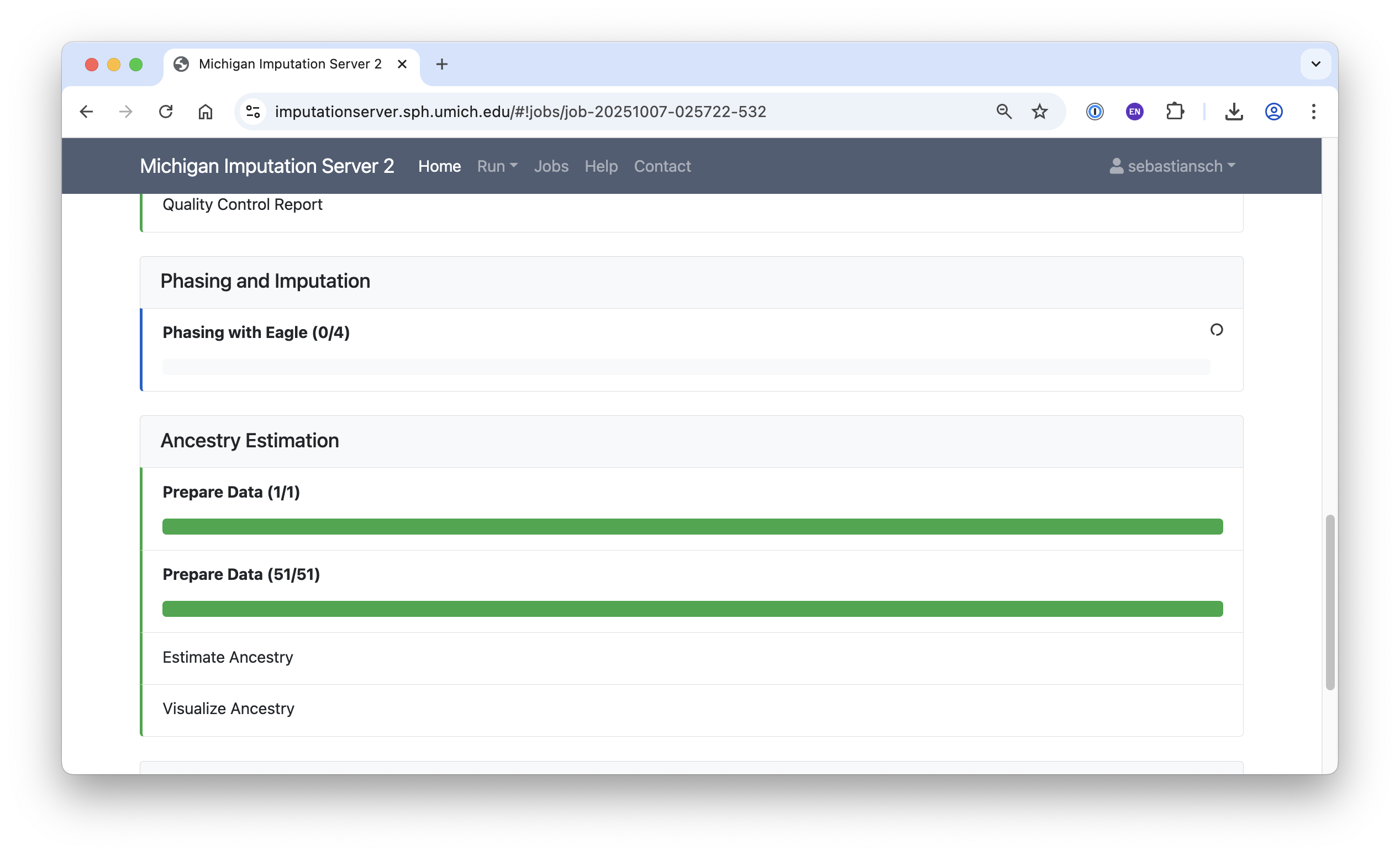 Once submitted, your job will go through Input Validation, Quality Control (QC), Phasing/Imputation, and Polygenic Risk Calculation. Jobs are queued, and you will receive a notification when your PGS calculation is complete.