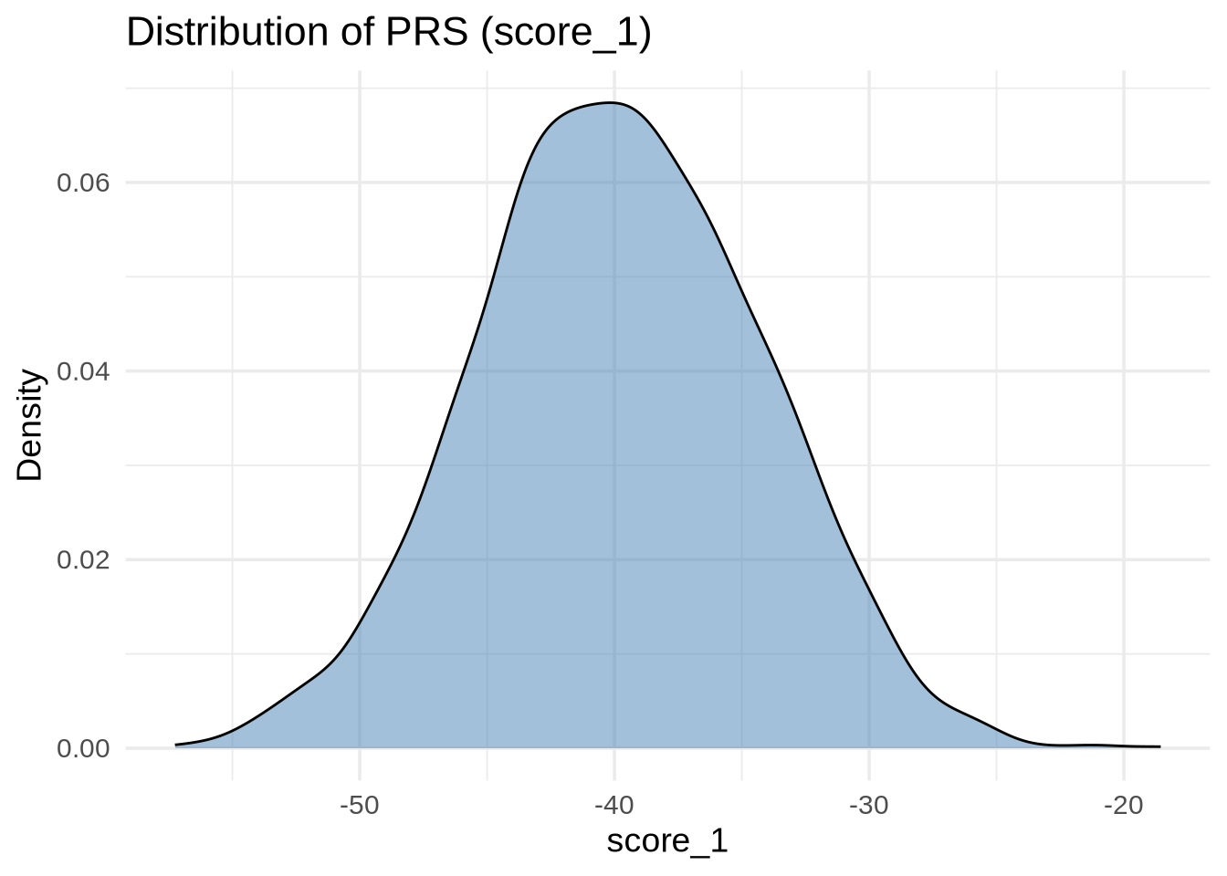 merged <- inner_join(scores, phenos, by = c("sample" = "IID"))Exploring the Distribution of PRS Scores